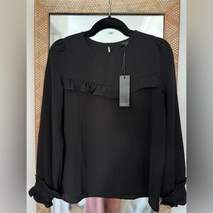 NWT Chic black top with stylish ruffle accents across chest and on sleeve cuffs. Ideal for versatile wear dress up or wear with some jeans. Super cute! Also great with slacks for business wear!