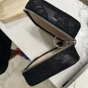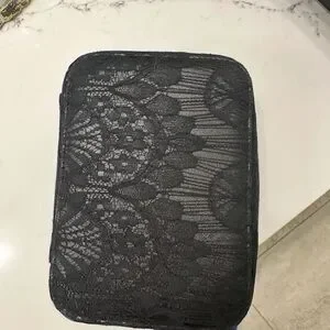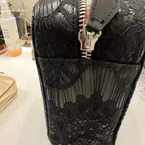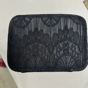 • Main Case: Black lace over a black base; soft-sided with zip closure. Approx. 5.5” W x 7.5” H x 2.5” D.