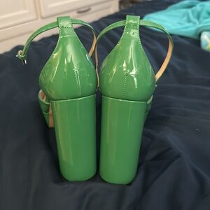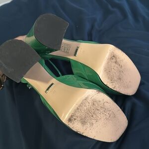 Elegant Gucci heels in glossy green. Features signature logo detail. Perfect for a bold look. Worn once.