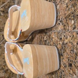 A size 9.5 pair of Floral Sandals by Skechers.. please view all pictures as these are the exact shoes you will receive.. I cannot find the size tag but based on my shoe size I will say a 9.5 fit.. no box included..