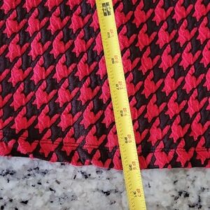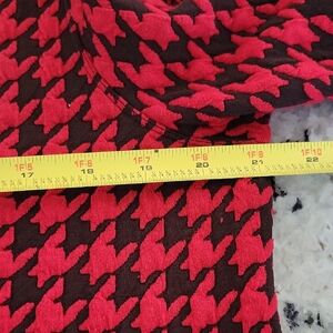 Red and black houndstooth pattern and crinkle stitch to fabric. Feels more like fall/winter weight, maybe a good football top :) A-line fit with 21" bust and 29/30" hem. 30" long. EUC, no flaws.
