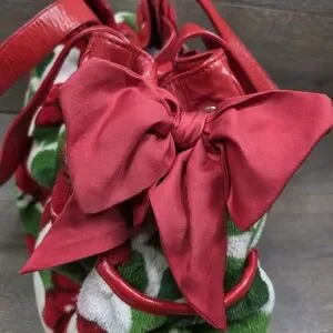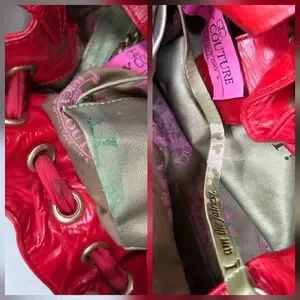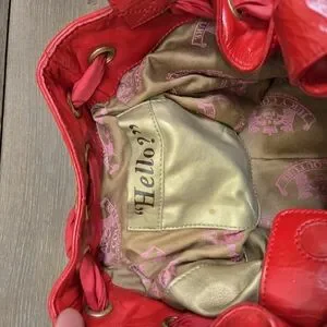 Red Satin entwines in gold grommets with a bow on the side of bag. Red leather handles and bottom base of bag. Multiple pockets perfect for storing your phone laptop and all your goodies in this spacious rare bag!