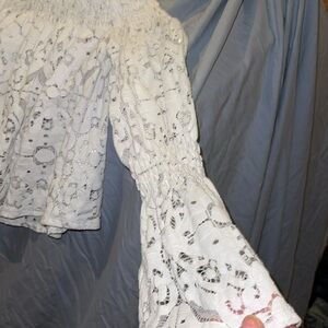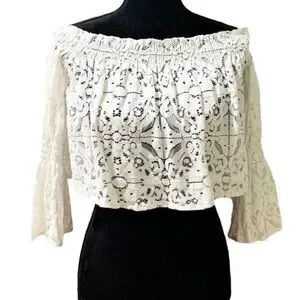 Very pretty Zara lacy crop top with bell sleeves. The elastic neck let you wear it up or on your shoulders. It’s a see-through lace and gorgeous. In EUC Please see pictures for details thank you for shopping my closet.