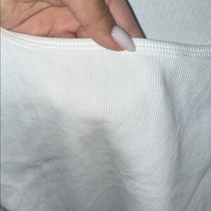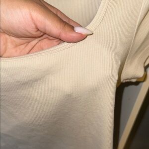 Stylish square neck t-shirts. Includes black, white and beige colors. Comfortable and versatile. The material is ribbed and it’s fitted with a somewhat of a stretch to it. All three shirts are a size medium.