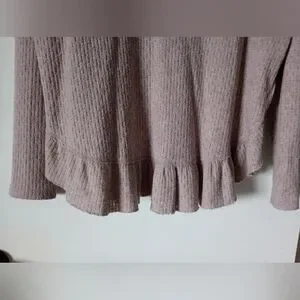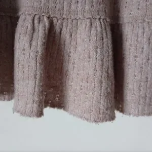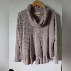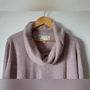 Stay warm and stylish with this cozy cowl neck sweater by Maeve. Perfect for any occasion, this soft dusty pink / heather pink sweater adds a touch of elegance to your wardrobe. It is super soft, relaxed fit, and machine washable. It features a raw bottom hem and ruffles. This beautiful sweater is in gently used condition and comes from a non-smoking home.