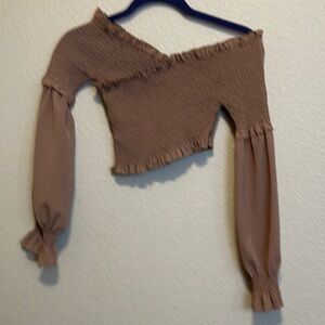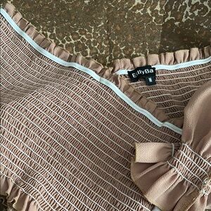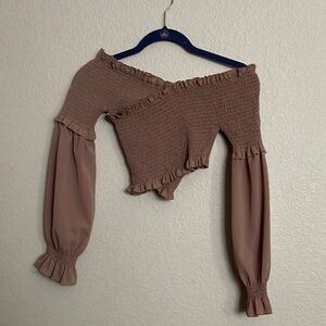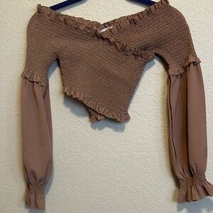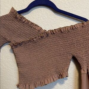 Chic and stylish off-shoulder top with ruffled details. Perfect for any occasion. Enjoy the elegant brown color that complements any wardrobe. Please see all pictures as it has been gently worn.