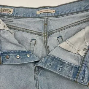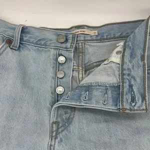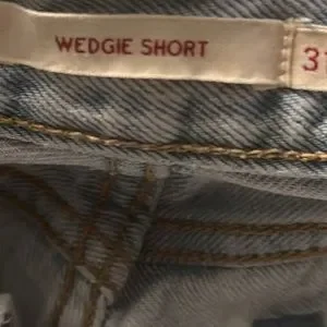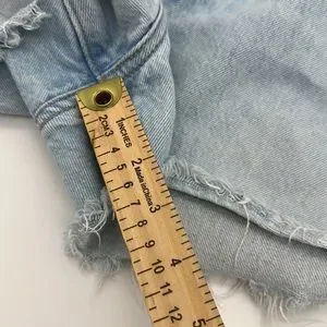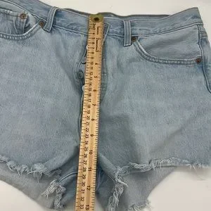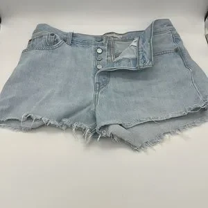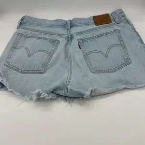 Classic Levi's denim shorts. Light blue wash. Frayed hem. High-waisted fit, not stretchy.