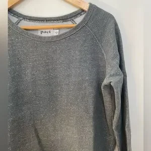 Pact crewneck style pullover sweatshirt in a green colorway with a white space dye. Embroidered Pact logo on sleeve. Fairly lightweight with Terry interior. 100% organic cotton. Marked size women’s large. In excellent preowned condition, no flaws. Smoke free home.