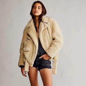 FREE PEOPLE WE THE FREE So Cozy Slouchy Moto Teddy Jacket Beige