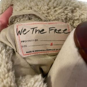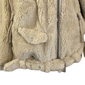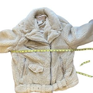 FREE PEOPLE WE THE FREE So Cozy Slouchy Moto Teddy Jacket Beige in size Small. In EUC, with faint fabric wear. Also note some markings to inner liner near under arm, shown up closely in pictures. Comes from a smoke-free, cat-friendly home. Measurements are included in pictures. Please inspect pictures closely, and let me know if you have any questions!