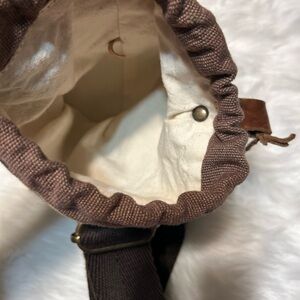 Pre owned. Good condition. Signs of use shown in pictures. I stuffed it with towels to show the shape of it. Elegant brown leather with vibrant striped fabric. Ideal for travel essentials.