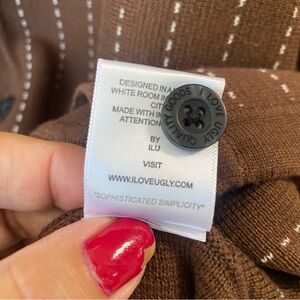 I Love Ugly Cardigan Sweater. Collared. Long Sleeves. Button Front Closures. “Stay warm and stylish with this brown & white men's sweater. Perfect for any casual outing.” In Very Good Condition.