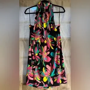 Brighten up your wardrobe with this stunning Trina Turk mini dress. Featuring a bold oversized floral print in vibrant pink, teal, yellow, and green on a black background, this sleeveless halter-style dress is perfect for summer parties, vacations, or a fun night out. The dress has a flattering A-line silhouette with a keyhole back button closure and a flowy fit that moves beautifully.