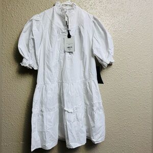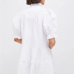 Chic white Dress with ruffled collar. Features button front and puff sleeves. Ideal for elegant occasions.