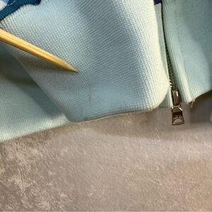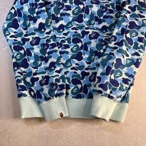 Stylish Bape zip-up sweater. Features iconic shark design. Blue camo pattern. Comfortable and trendy.