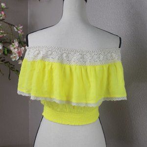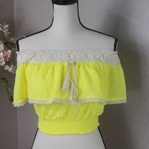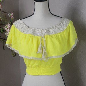 This is absolutely adorable! This lemon yellow top has beautiful cream lace accent, and a decorative tie. Elastic at the bottom. Perfect condition.