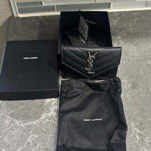 Chic black leather wallet with iconic YSL logo. Quilted texture adds elegance. Ideal for stylish essentials.