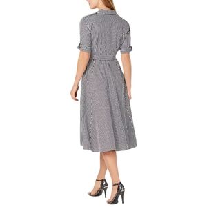 Classic Calvin Klein shirtdress featuring timeless black and white gingham check pattern. Button-down front styling with removable belt for defined waist silhouette. Roll-up sleeves with tab detail. Midi length hem perfect for versatile styling from office to weekend.