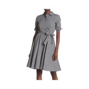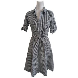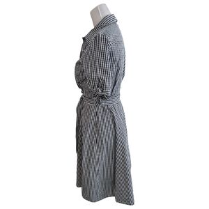 **Keywords:** Calvin Klein dress, gingham shirtdress, black white check, button down dress, belted midi dress, preppy style, office wear, cottagecore aesthetic, timeless fashion, workwear, capsule wardrobe essential, vintage inspired, classic American style, size 2 dress, designer dress