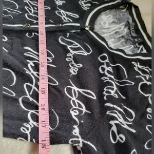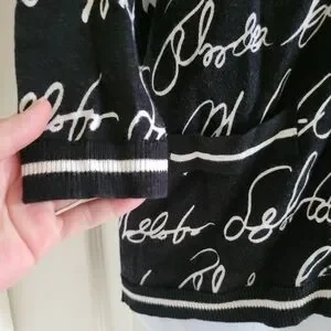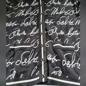Stylish black cardigan with white script design. Perfect for layering.