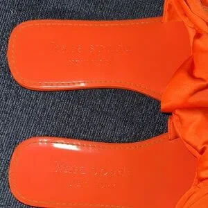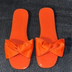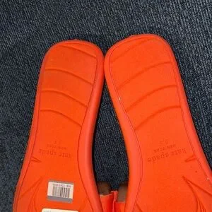 These cute orange Kate Spade slides have never been worn and are in fantastic condition. They run a bit small for me, but these should work if you have slimmer feet or wear a smaller size. It also comes in a cute pink drawstring bag.