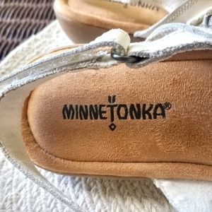 Minnetonka Leather Sandals in excellent condition, gently worn just a few times. Size 8, white leather uppers, rope decorative embellishment on front, super soft and cushioned footbed, adjustable ankle strap.