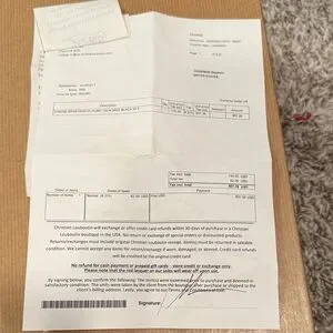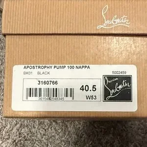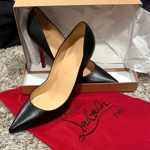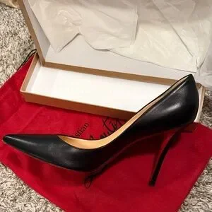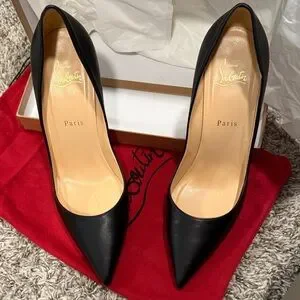 Elegant black heels with iconic red soles. Sleek and stylish design. Perfect for any occasion. Worn only once at an outdoor grand opening event. There are scuffs on the bottom due to that and they are pictured. Comes with box and dust bag. Proof of purchase in photograph.