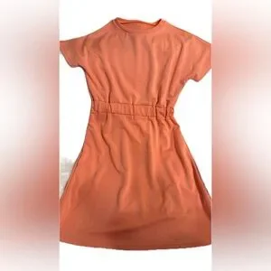 Stylish orange dress with short sleeves. Features a cinched waist for a flattering fit. Shoulder to hem 38”. NWOT