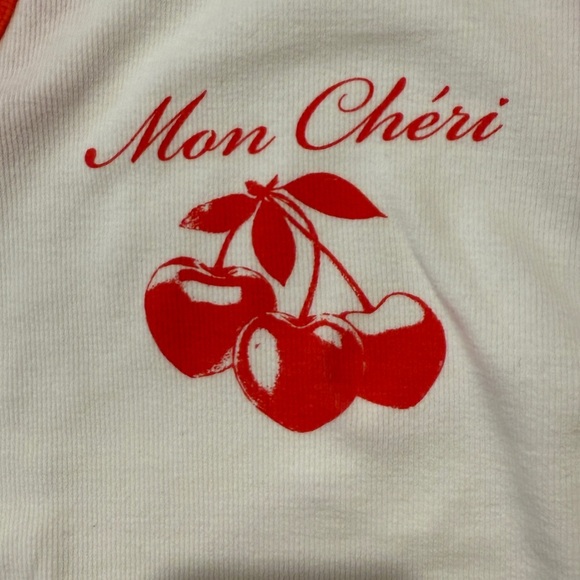 Stylish tank top with a cream base and red trim. Features a chic cherry design. Perfect for casual wear.