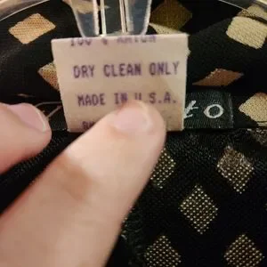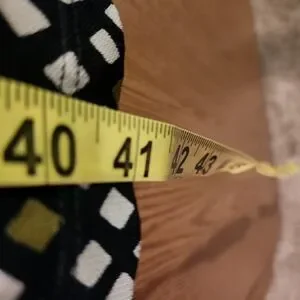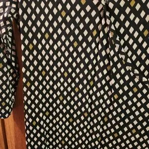 This dress has a diamond pattern on it, and is white, green, and black. It is 100% rayon and is about 41" long from shoulder to hem.