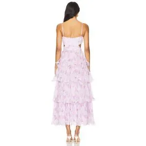 100% polyester. Made in China. Dry clean only. Fully lined. Hidden back zipper closure. Side cut-outs. Lightweight chiffon fabric with ruffle trim.