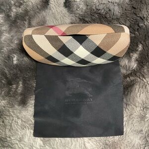 Elegant Burberry eyeglass case with classic plaid design. Features black and tan hues with dust cloth