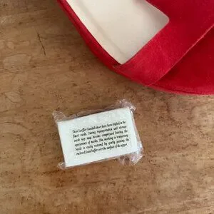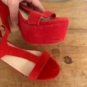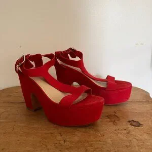 These Size 9 red suede heels are such great party shoes! They're kind of a mix between a heel and a platform if you ask me. They've been worn 2-3 times. There's one black scuff on the inside of the left heel that I believe could be removed with the enclosed foam buffer. Dust bag is also included. Only getting rid of them because I don't have enough occasions to bust them out for!