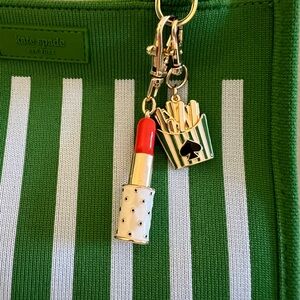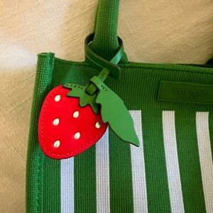 Vibrant tote with playful green and white stripes. Features charming keychain accents.