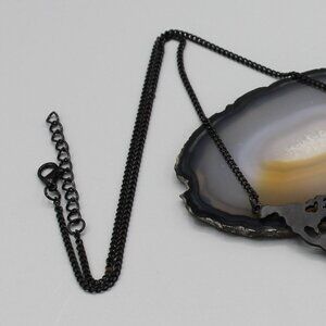 This is a brand new black plated necklace with a pendant representing the world. The approximate measurements of the pendant are: 2-3/4" x 1". The chain is cable style with a lobster clasp and it is 18" long plus it has a 2" extension. The finished weight of the whole necklace is 12 grams.