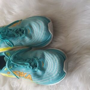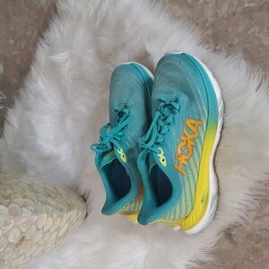 These Hoka womens running shoes offer comfort and style with a vibrant teal and yellow design. Perfect for active days, they provide excellent support and durability.