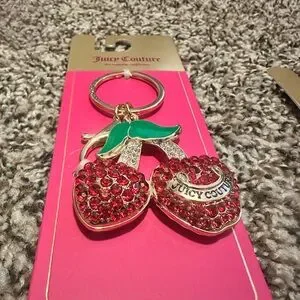 Charming cherry design with glittering red stones. Green leaf accent adds a fresh touch. Perfect for keys or bags.