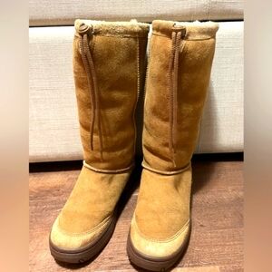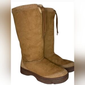 UGG vintage brown tan leather tall Drawatring boots sheepskin Platform Sherpa 9