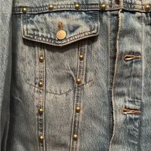 Stylish light blue jean jacket. Features stud embellishments on front. Classic button-up design. Perfect for casual wear.
