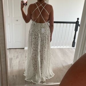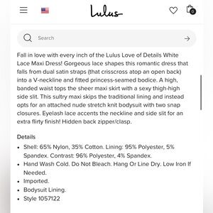 It’s a sheer dress with a high slit and a comfortable nude bodysuit built in. I’d highly recommend looking at the dress on Lulus website, where you can find a bunch of reviews, photos, and further details: https://www.lulus.com/products/love-of-details-white-lace-maxi-dress/1057122.html