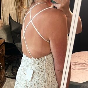 It’s still in new condition with the tags still attached, however I had the thin white ribbon straps replaced with a higher quality white beaded straps instead. There is a zoomed-in photo of the back of the dress that shows the beaded straps. The photo of the back that isn’t zoomed in shows the original straps before I had them replaced. The difference is very subtle, but the new straps feel more secure and look more elegant. I believe I paid $150 for the dress and another $100 for the new straps.