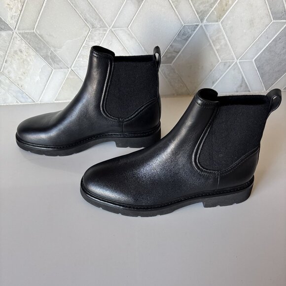 This is a pair of black Vince ankle booties in size 7.5M. These boots are a unique take on a very timeless and classic design; a round toe ankle boot. These boots are elevated above other options by their composition, including 30% wool in their build, which is present to create the comfortable, convenient, and distinctive elastic portion which breaks the solid black acrylic of the rest of the boots. These boots are designed with ultimate versatility in mind, being water repellent by design, making them capable of resisting a degree of terrain and weather condition, increasing the usefulness of these boots while maintaining a fashionable appearance! The simple, bold black material on the boots, combined with the slightly wider sole than the upper and round toe make these boots stand out beyond other options even further. The bottoms of the soles are built sturdily, and are textured to aid with slip resistance during wear, and support the soft insole to create even more comfort! These boots also feature a tab at the top of the boot sleeves for easy wear. The boots are made in China and are in excellent condition all around. The exterior solid black material bears some minor marks, visible in pictures. The outsoles are in near pristine condition.