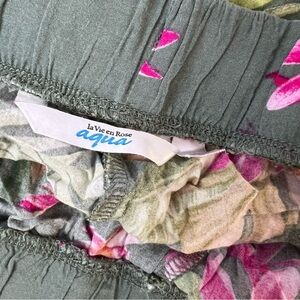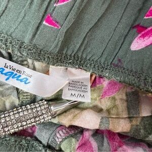 Stylish green pants with vibrant pink floral design. Comfortable and chic. Medium.