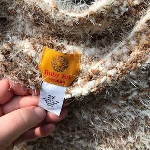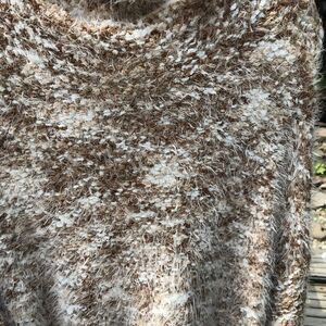 Fuzzy and very soft cream and tan sweater. Arm cuffs are open and wide. It is a very heavy and warm sweater.