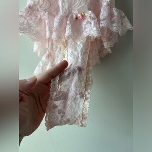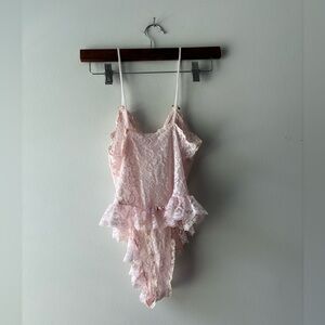 Great conditions vintage pink one piece babydoll. No stains, rips or bad odor. floral lace detail. Ruffled attached skirt. Buttons up for closure. Stretchy. Rare and vintage. Beautiful piece for special occasions or just to have. No tag. Coquette trendy style. Please see pictures for more details.