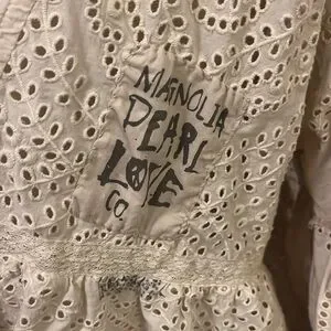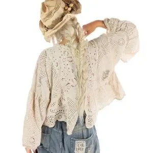 Romantic bell sleeves add allure to this ethereal cotton lace blouse. Details include eyelet and embroidery throughout, a v-neckline, and a gathered waist. Finished with a row of snaps and the Magnolia Pearl logo applique in back. Moonlight.
