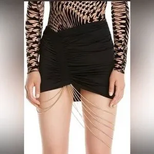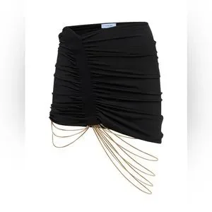 Asymmetric ruching gather this barely-there mini slung with golden chains that drape the legs, catch the light and turn all the heads.