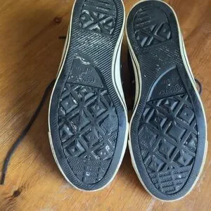 Stylish black high-top sneakers featuring gold eyelets and white soles. Perfect for casual wear.