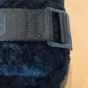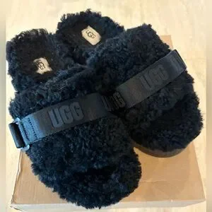 Ugg Fluffita Platform Slides Slipper Sandals. Sheepskin upper and footbed with open toe (doesn’t stretch), appropriate 1.75” heel and platform height, molded EVA outsole. The strap across the top is for detail only. Box included. Size 7