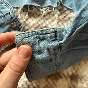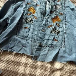 Stylish denim jacket featuring colorful animal embroidery. Perfect for casual wear. Missing a button on one arm. I actually had been wearing this for years and never noticed the button was missing until I was taking pictures LOL size small but I’m a true medium and it fits perfectly.